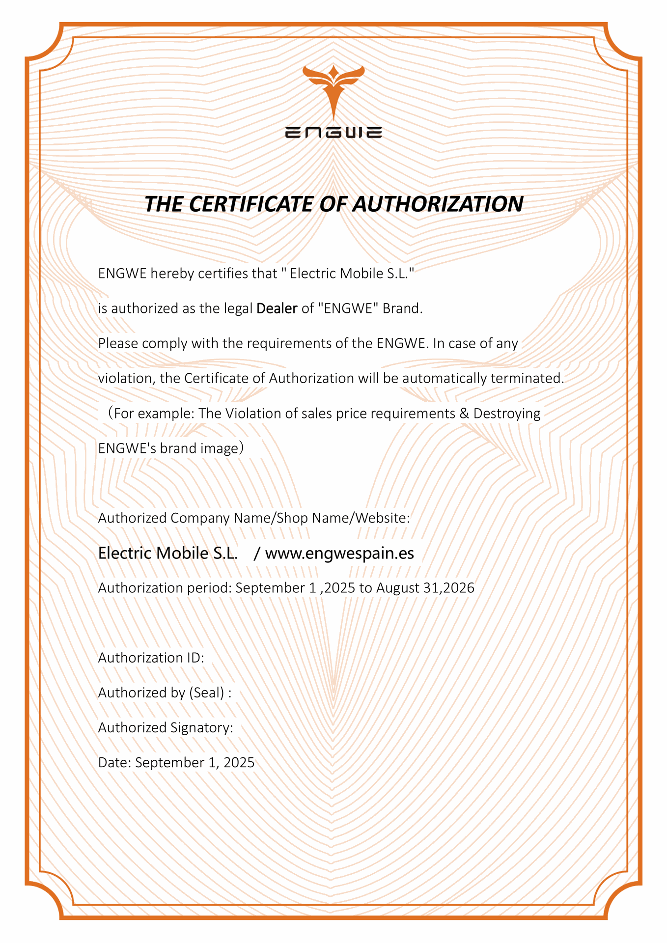 Electric Mobile S.L es un distribuidor autorizado oficial de la marca ENGWE en España. Ofrecemos bicicletas eléctricas ENGWE auténticas, accesorios originales y un servicio profesional respaldado por nuestro certificado de asociación oficial.